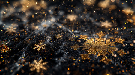 This captivating image features sparkling snowflakes on a black background, interspersed with golden bokeh lights, creating a magical winter atmosphere perfect for festive themes.