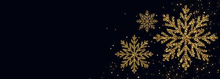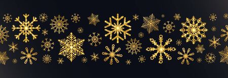 Golden snowflakes border on black background. Merry Christmas and Happy New Year greeting card with glitter gold snowflakes. Luxury holiday decoration banner. Vector illustration.