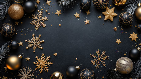 Elegant Christmas and New Year background with festive decorations like snowflakes, stars, and baubles on a dark surface, top view