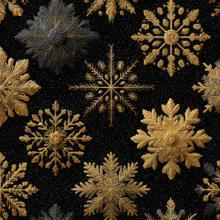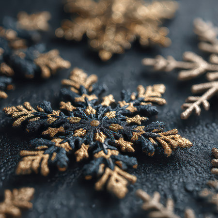 Shimmering gold snowflakes displayed beautifully on a textured matte-black backdrop.