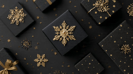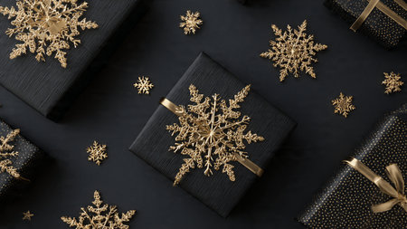 This image showcases an arrangement of wrapped gifts adorned with golden ribbons and sparkling snowflake ornaments. The composition features a dark backdrop, creating a contrast with the bright metallic colors. The visual style suggests a festive atmosphere, possibly suitable for promotional materials or editorial content related to celebrations and gifting.