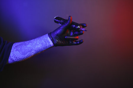 Closeup of tattooer master's hand in black glove holding machine for making tattoo art on body isolated on dark background in neon. Concept of art, job, hobby, professional equipment. Flyer for ad