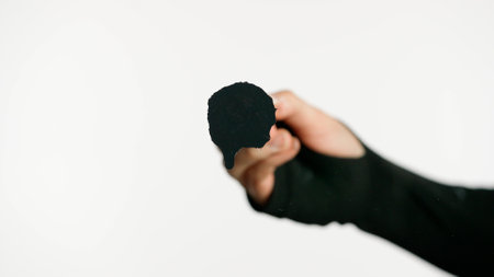 Male hand measuring or holding invisible item, mans palm making gesture while showing small amount of something on black isolated background