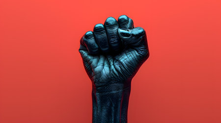 Gesture of a black fist against an electric blue background