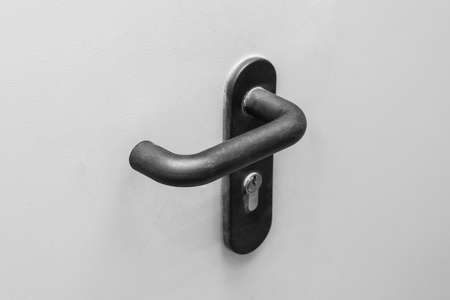 Vintage black doorhandle on white wood background closeup