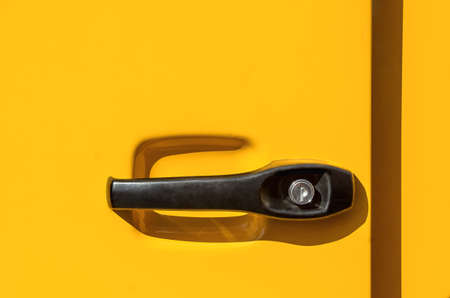 Close up shot of a modern door handle of a yellow car.