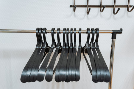 lot of plastic black hangers on the bar. Concept store, sale, design, empty hangers.