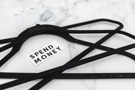 shopping and purchasing power in the post pandemic economy, group of clothes hangers with Spend Money text in the middle concept of buyers reducing their spending