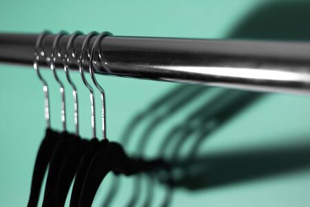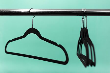 Close-up of clothes rack with black empty hangers on background of aqua menthe color.