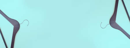 Banner. Wooden clothes hanger on a turquoise background. Copy space. Place for text. Shopping concept. Flat lay.