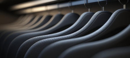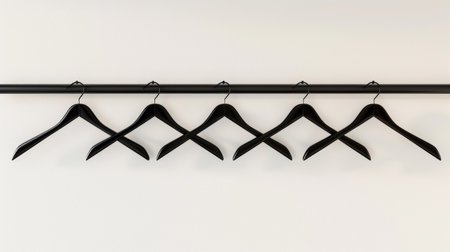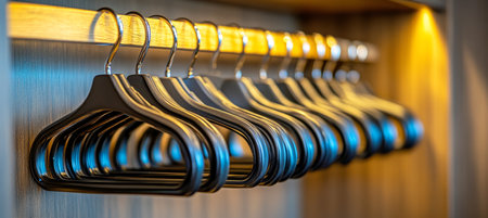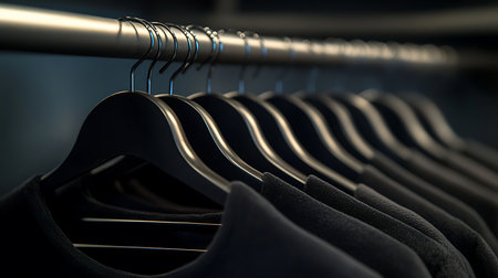 Sleek black hangers arranged methodically on a metal bar, set against a soft, out-of-focus backdrop ideal for showcasing closet or retail display ideas.