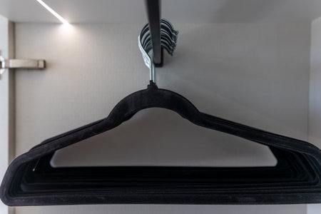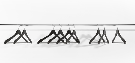 A collection of black clothes hangers hanging neatly on a white wall, creating a functional and organized storage solution for clothing items. The hangers are evenly spaced apart, providing a clean and minimalist aesthetic to the room.