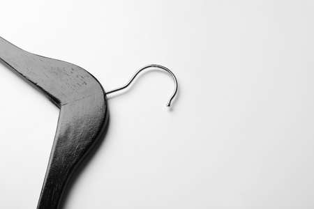 Black wooden hanger for clothes hanging on silver holder against the white background