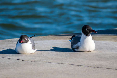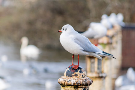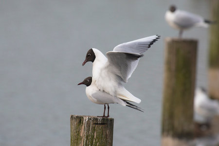 A couple Black-headed Gulls (Chroicocephalus ridibundus) mating on a wooden pole in a lake