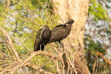 Two green ibis roosting in tree in the Pantanal, Brazil.