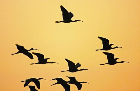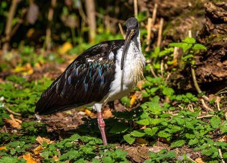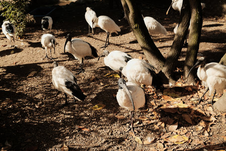 Group of white ibises with black heads walking under trees in autumn sunlight at Belgrade Zoo. Natural wildlife scene