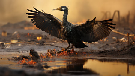 spill black oil illustration pollution wildlife, marshland bird, contamination disaster spill black oil