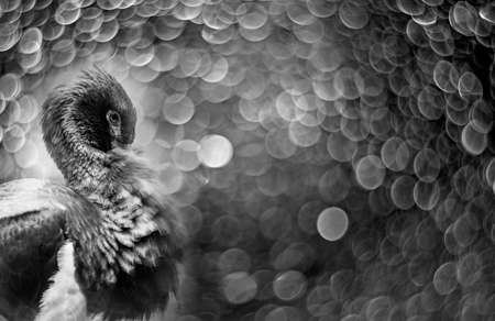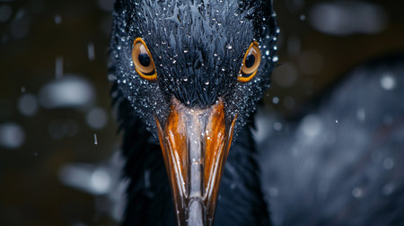 Bird with wet feathers and an orange beak. The bird is looking at the camera. The image has a moody and mysterious feel to it