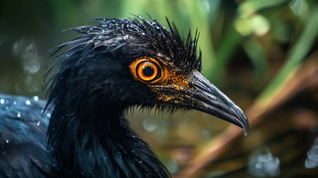 Bird with a black head and orange eyes. The bird is wet and has a lot of feathers