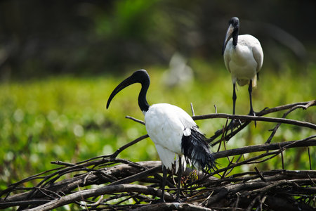 two african sacred ibises together at the water side, tropical wading bird specie from Africa