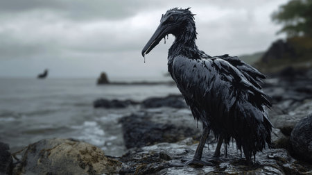 A black bird struggles on a rocky shore, coated in oil, against a backdrop of gray clouds and choppy water, highlighting environmental concerns.