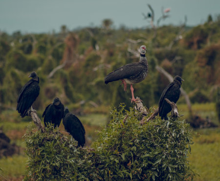 A closeup of a Crested Screamer and black ravens perched on a green bush