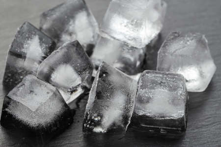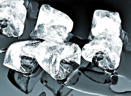 Clear ice cubes melting on a dark reflective surface with water droplets and a subtle sheen.
