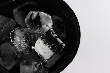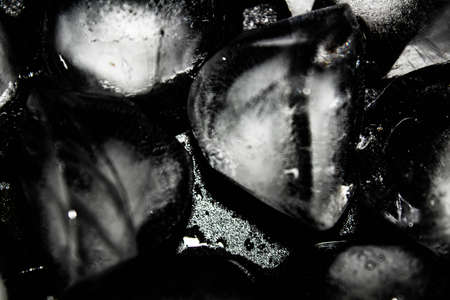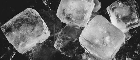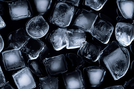 Assortment of ice cubes glistening on a dark background, creating contrast. Copy space