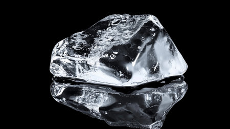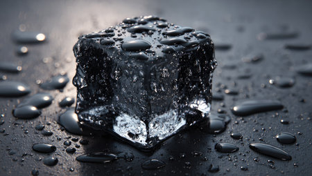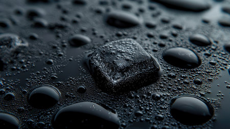 This macro photograph captures droplets of water on a clear ice cube against a sleek black surface. The image showcases texture and purity, ideal for refreshment themes.