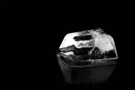 A detailed shot of a transparent ice cube, showcasing its irregular shape and smooth, wet surface, with a subtle reflection.