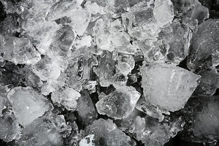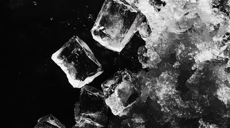 Irregular chunks of ice on a black background, adding dramatic contrast. Copy space