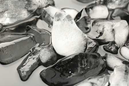 Close-up macro shot of ice cubes melting on a reflective surface, with water droplets capturing the cool and refreshing atmosphere
