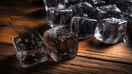 Clear ice cubes glistening against a dark background, perfect for refreshing beverages