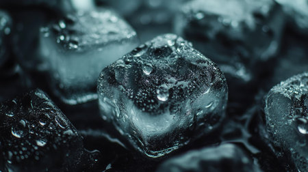 A captivating close-up of ice cubes resting on a dark surface, adorned with glistening water droplets. The interplay of light and texture creates a stunning visual.