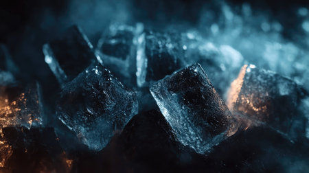 Glistening ice cubes are submerged in effervescent dark water, with sparkling highlights creating a refreshing and invigorating visual experience. Generative AI