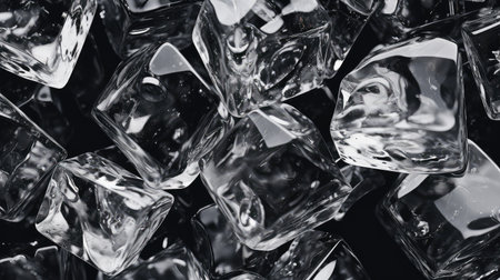 Close-up view of crystal ice cubes showcasing sharp edges and clear transparency against a black background, perfect for beverage and culinary themes.