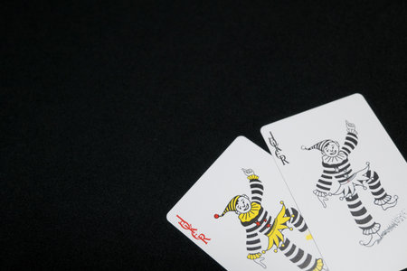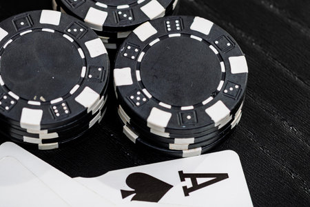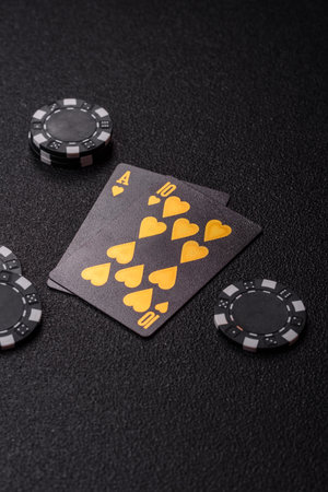 Playing card game poker in casino with chips, bets and risk. Cards and chips on black felt as background for your design