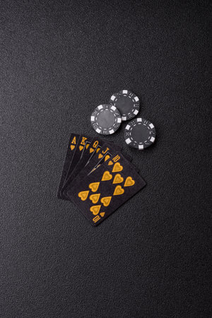 Poker game with Royal Flush combination. Chips and cards on the black table. It's a big win at poker