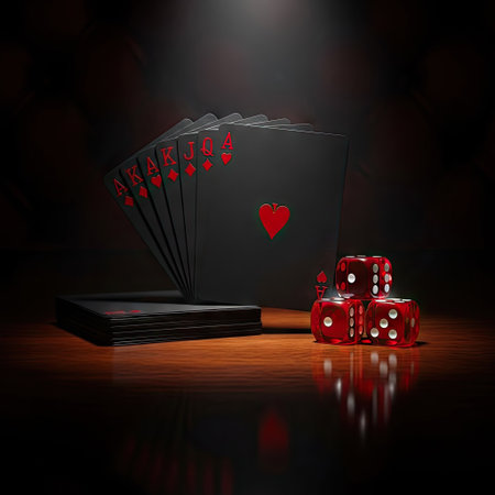 A deck of playing cards and a set of red dice are arranged on a wooden surface. The composition features a stack of cards and a fanned display of others. The lighting highlights the objects against a dark background, creating a reflective surface. This image is suitable for promotional materials, articles, and various design projects.