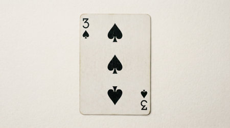 A top down view of a single playing card, the three of spades, placed vertically in the center of a clean, minimalist, light colored surface.