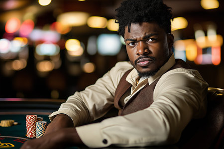 A young Black man sits at a poker table in a bustling casino, visibly frustrated as he contemplates his next move. The vibrant atmosphere enhances the intensity of the moment.
