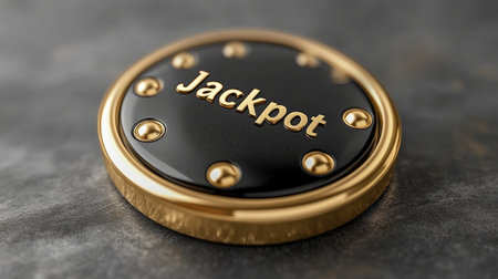 Golden jackpot word written on black coin with golden frame representing winning, gambling, success and luck
