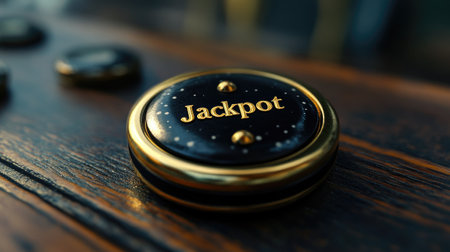 Golden jackpot button on a wooden surface represents winning, gambling, and achieving the ultimate prize