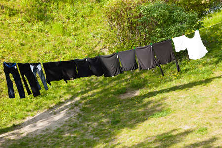 Housework. Clean wet laundry clothes hanging to dry on the line clothesline outdoor. Village.