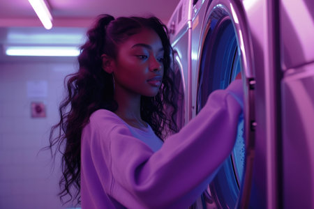 Laundry Day Elegance: Young Black Woman Retrieving a Purple Sweater