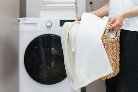 housekeeping at home. Cropped view of woman with laundry basket standing against washing machine in white room. Hotel service or general cleaning routine concept