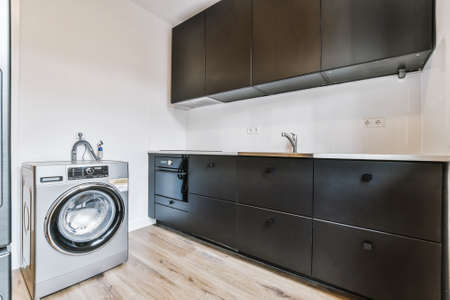 Black cupboards with stove and sink located near contemporary washing machine in kitchen of apartment
