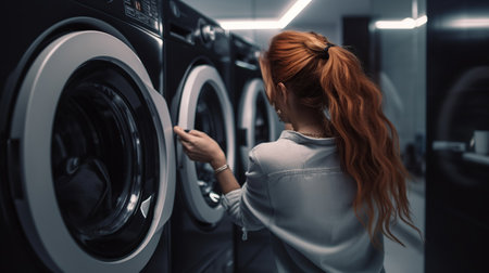 Young woman taking down jacket from washing machine room, generative ai