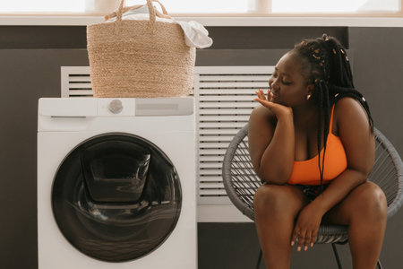 Bored curvy African woman waiting for clean clothes while sitting in chair near the washing machine