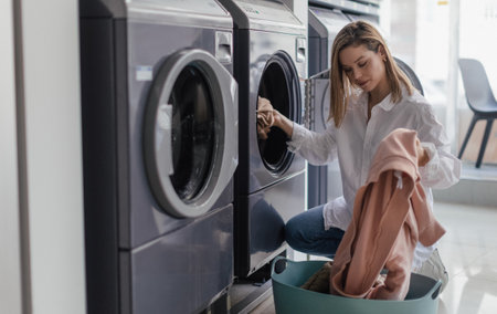 Pretty young woman putting, getting some dirty clothes into a washing machine in a laundry, laundry cleaning